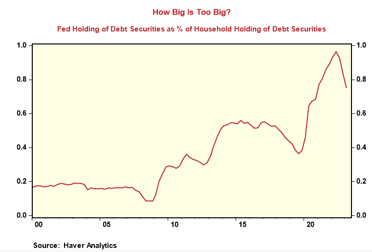 At what point does the Fed's buying of debt securities cross the line and become so big that it manipulates the financial markets? In 2022, the Fed's debt securities holdings roughly equaled what households own directly and indirectly in other managed accounts. Before the financial crisis, the Fed's holdings were below 20%, moved to 50% after the crisis, and the pandemic pushed it to a record high near 100%. Perhaps so many trusted financial indicators have erred in recent months because finance is no longer a free market--- QE is manipulating it.