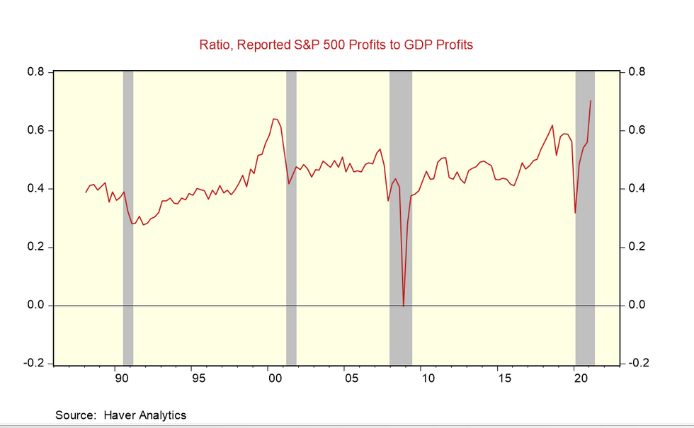 In Q1, the ratio of reported S&P 500 operating profits to GDP profits hit a new record of .70%, far above the previous high of .64% posted during the tech equity bubble of 2000. That outperformance is a function of equity asset inflation and not a superior operational performance of S&P companies. In other words, an equity market correction would hit reported S&P reported profits doubly hard but will hardly move the needle on GDP profits.